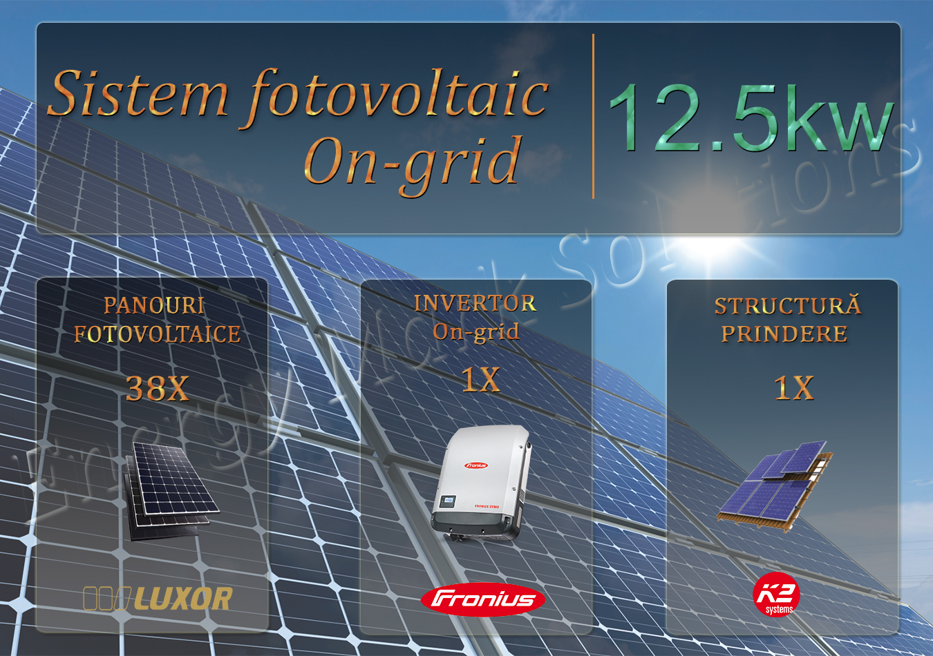 Sistem fotovoltaic on-grid complet compus din panouri fotovoltaice monocristaline Luxor 340 W * 38 buc, invertor on-grid trifazat Fronius 12.5 kw 1 buc, cabluri solare si conectori MC4 1 set. Elemente si de racordare la tabloul general al casei si tablou de sigurante si protectie. Optional la cererea clientului se poate asigura structura de suport si prindere a panourilor pe acoperis inclinat 38 buc.