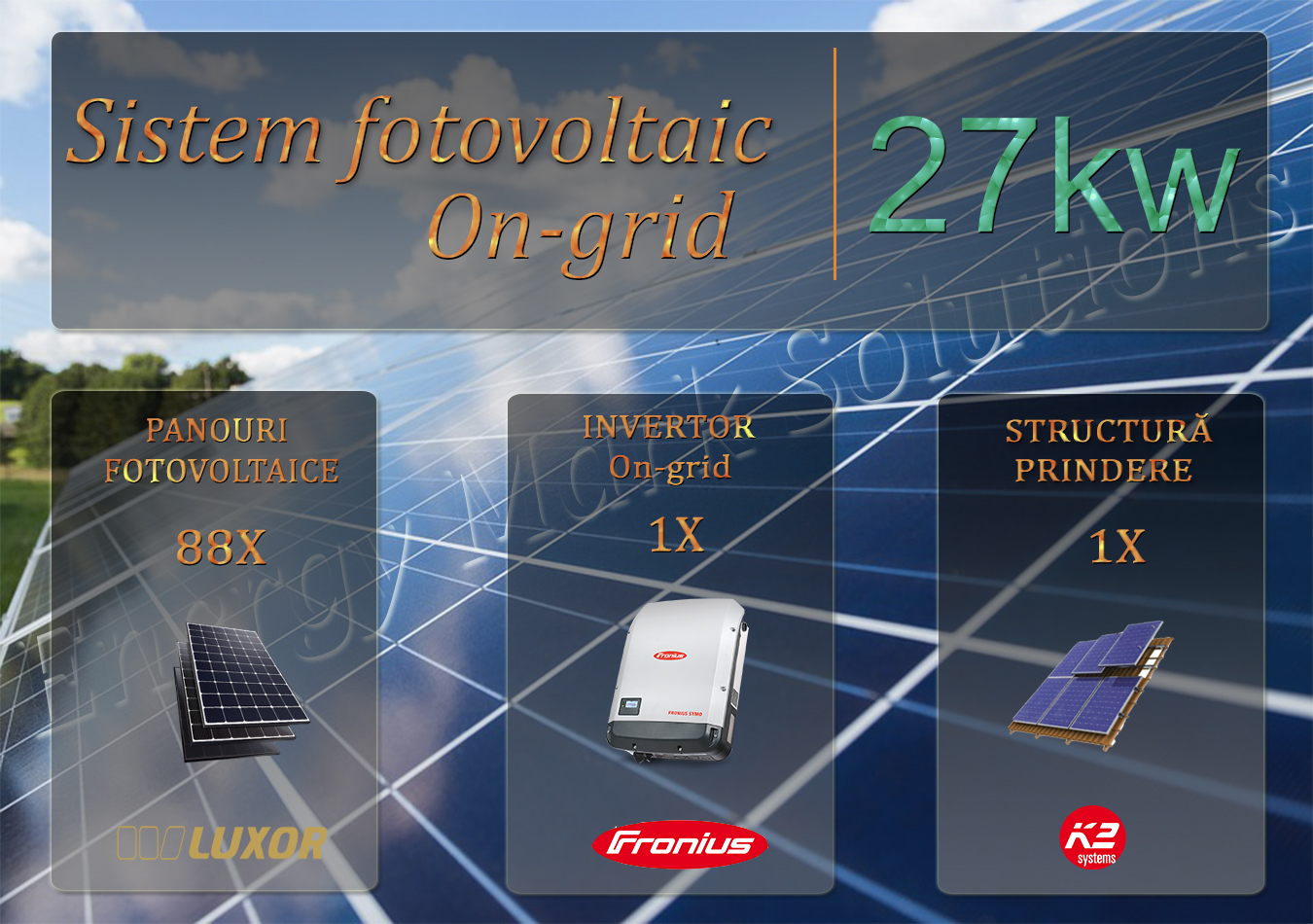 Sistem fotovoltaic on-grid complet compus din panouri fotovoltaice monocristaline Luxor Solar M120/340W * 88 bucati sau JA Solar JAM54S30 405/MR * 69 bucati, invertor on-grid trifazat Fronius 27 kw 1 buc, cabluri solare si conectori MC4 1 set. Elemente si de racordare la tabloul general al casei si tablou de sigurante si protectie. Optional la cererea clientului se poate asigura structura de suport si prindere a panourilor pe acoperis inclinat.