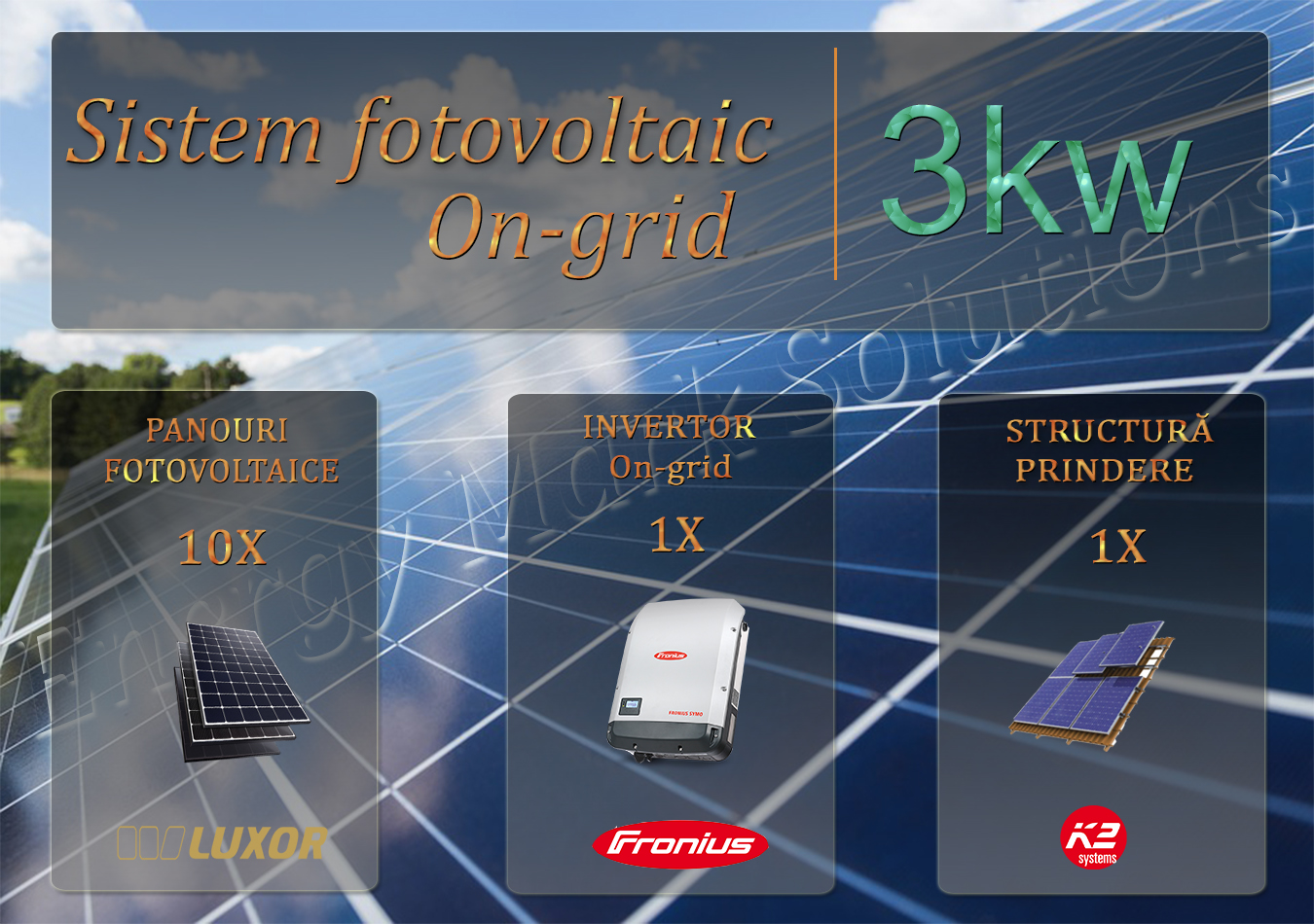 Sistem fotovoltaic on-grid complet compus din panouri fotovoltaice monocristaline Luxor 340 W * 10 buc, invertor on-grid trifazat Fronius 3 kw 1 buc, cabluri solare si conectori MC4 1 set. Elemente si de racordare la tabloul general al casei si tablou de sigurante si protectie. Optional la cererea clientului se poate asigura structura de suport si prindere a panourilor pe acoperis inclinat 10 buc.