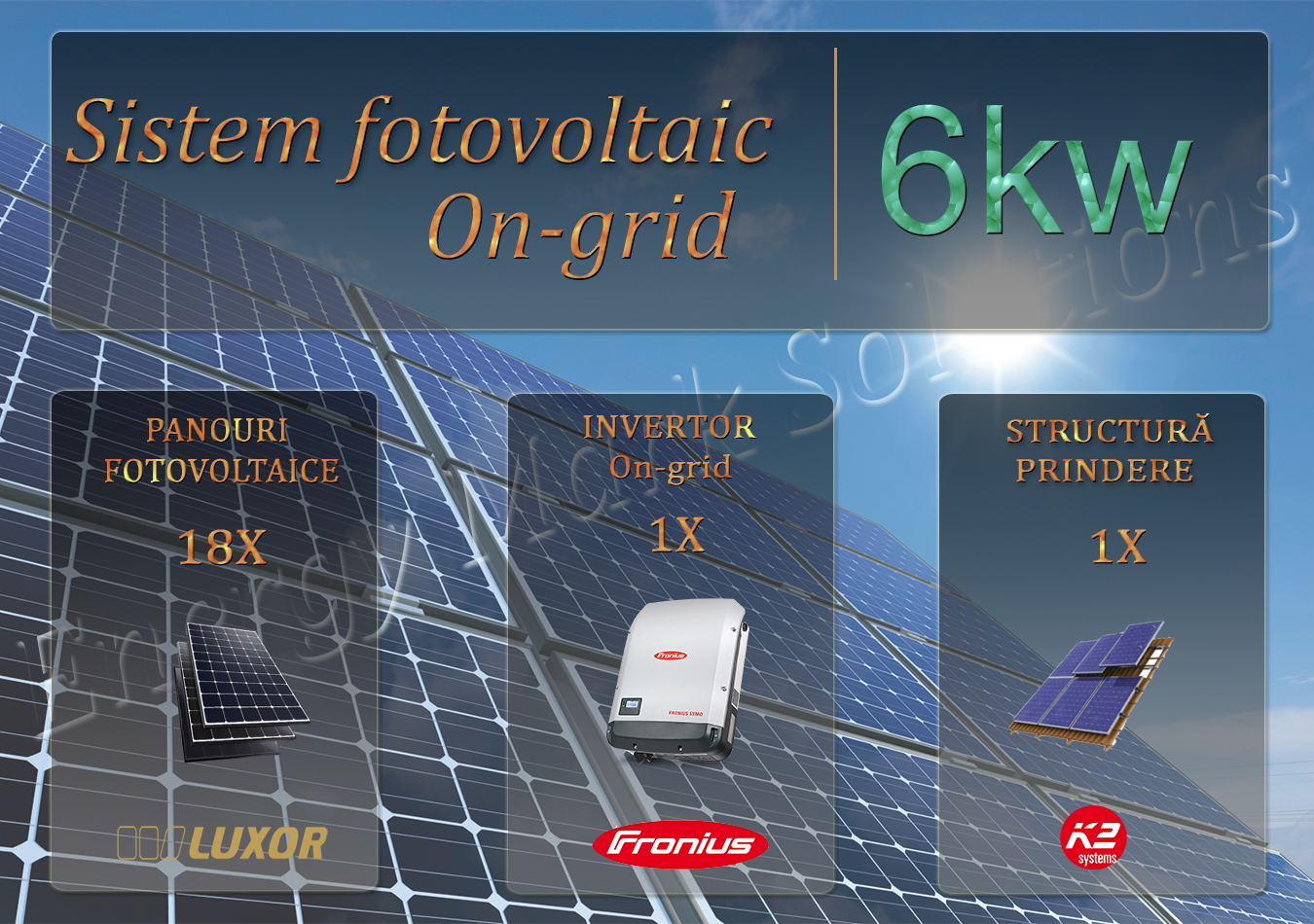 Sistem fotovoltaic on-grid complet compus din panouri fotovoltaice monocristaline Luxor 340 W * 18 buc, invertor on-grid monofazat Fronius 6 kw 1 buc, cabluri solare si conectori MC4 1 set. Elemente si de racordare la tabloul general al casei si tablou de sigurante si protectie. Optional la cererea clientului se poate asigura structura de suport si prindere a panourilor pe acoperis inclinat 18 buc.